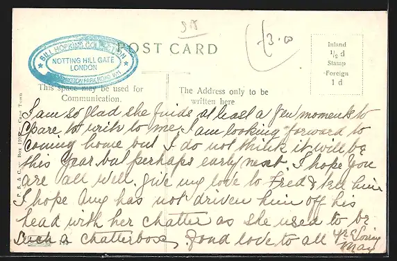 Personenbezogene Daten auf der Rückseite der Karte wurden durch blauen Textmarker unkenntlich gemacht. Die blauen Stellen sind auf die Vorderseite durchgeweicht und wirken sich negativ auf das Postkartenfoto aus