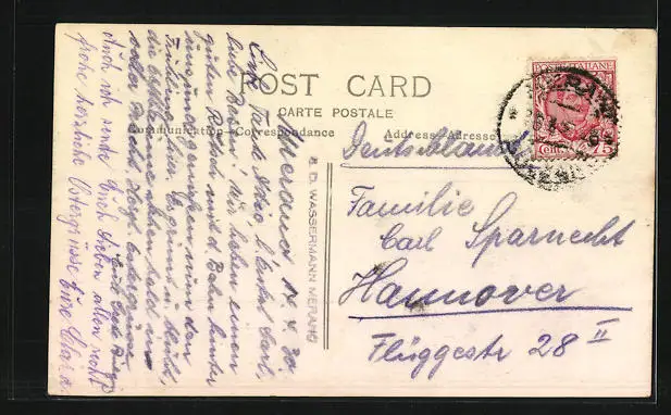 Personenbezogene Daten auf der Rückseite der Karte wurden durch blauen Textmarker unkenntlich gemacht. Die blauen Stellen sind auf die Vorderseite durchgeweicht und wirken sich negativ auf das Postkartenfoto aus