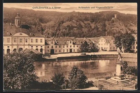 AK Carlshafen a. d. Weser, Hafenplatz und Hugenottenturm aus der Vogelschau