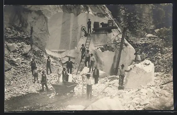 AK Carrara, Marmorsteinbruch mit Arbeitern