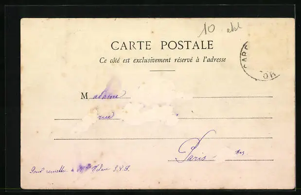 Personenbezogene Daten auf der Rückseite der Karte wurden durch blauen Textmarker unkenntlich gemacht. Die blauen Stellen sind auf die Vorderseite durchgeweicht und wirken sich negativ auf das Postkartenfoto aus