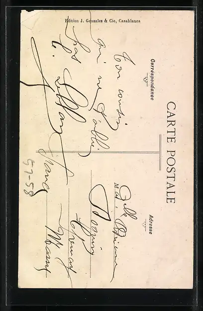 Personenbezogene Daten auf der Rückseite der Karte wurden durch blauen Textmarker unkenntlich gemacht. Die blauen Stellen sind auf die Vorderseite durchgeweicht und wirken sich negativ auf das Postkartenfoto aus