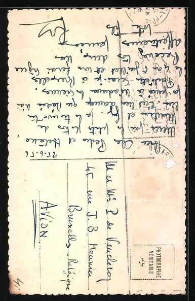 Personenbezogene Daten auf der Rückseite der Karte wurden durch blauen Textmarker unkenntlich gemacht. Die blauen Stellen sind auf die Vorderseite durchgeweicht und wirken sich negativ auf das Postkartenfoto aus