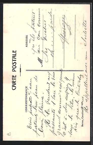 Personenbezogene Daten auf der Rückseite der Karte wurden durch blauen Textmarker unkenntlich gemacht. Die blauen Stellen sind auf die Vorderseite durchgeweicht und wirken sich negativ auf das Postkartenfoto aus