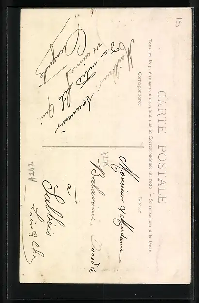 Personenbezogene Daten auf der Rückseite der Karte wurden durch blauen Textmarker unkenntlich gemacht. Die blauen Stellen sind auf die Vorderseite durchgeweicht und wirken sich negativ auf das Postkartenfoto aus