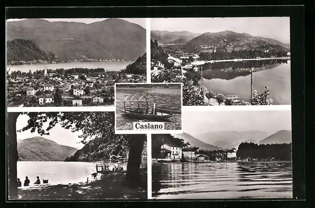 AK Caslano, Ortsansicht mit Bergen und See