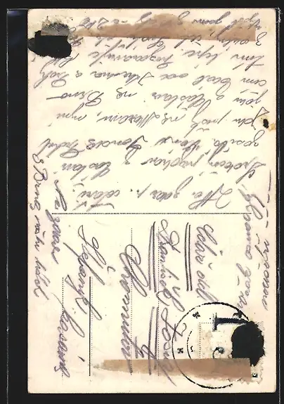 Personenbezogene Daten auf der Rückseite der Karte wurden durch blauen Textmarker unkenntlich gemacht. Die blauen Stellen sind auf die Vorderseite durchgeweicht und wirken sich negativ auf das Postkartenfoto aus