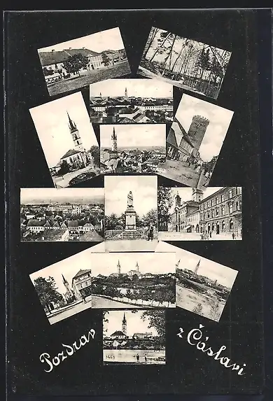 AK Caslav, Kirchen, Denkmal und Strassenpartie