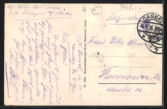 Personenbezogene Daten auf der Rückseite der Karte wurden durch blauen Textmarker unkenntlich gemacht. Die blauen Stellen sind auf die Vorderseite durchgeweicht und wirken sich negativ auf das Postkartenfoto aus