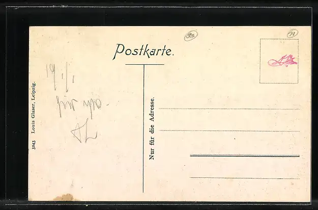 Personenbezogene Daten auf der Rückseite der Karte wurden durch blauen Textmarker unkenntlich gemacht. Die blauen Stellen sind auf die Vorderseite durchgeweicht und wirken sich negativ auf das Postkartenfoto aus