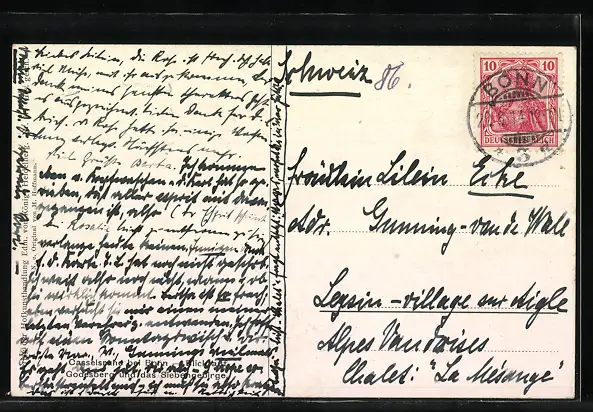 Personenbezogene Daten auf der Rückseite der Karte wurden durch blauen Textmarker unkenntlich gemacht. Die blauen Stellen sind auf die Vorderseite durchgeweicht und wirken sich negativ auf das Postkartenfoto aus