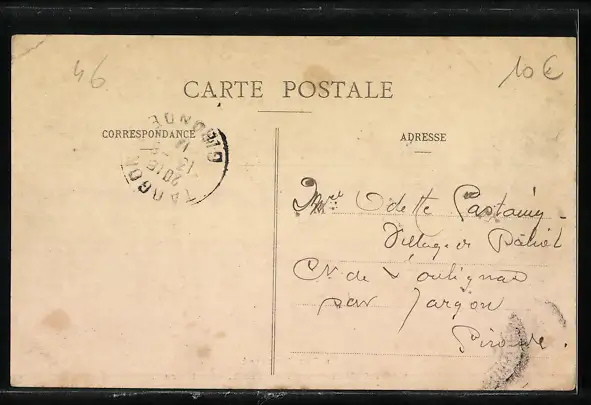 Personenbezogene Daten auf der Rückseite der Karte wurden durch blauen Textmarker unkenntlich gemacht. Die blauen Stellen sind auf die Vorderseite durchgeweicht und wirken sich negativ auf das Postkartenfoto aus