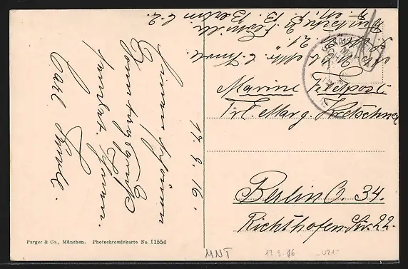 Personenbezogene Daten auf der Rückseite der Karte wurden durch blauen Textmarker unkenntlich gemacht. Die blauen Stellen sind auf die Vorderseite durchgeweicht und wirken sich negativ auf das Postkartenfoto aus
