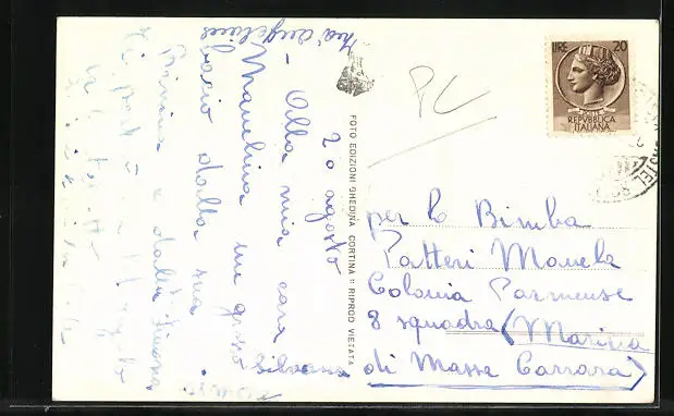 Personenbezogene Daten auf der Rückseite der Karte wurden durch blauen Textmarker unkenntlich gemacht. Die blauen Stellen sind auf die Vorderseite durchgeweicht und wirken sich negativ auf das Postkartenfoto aus