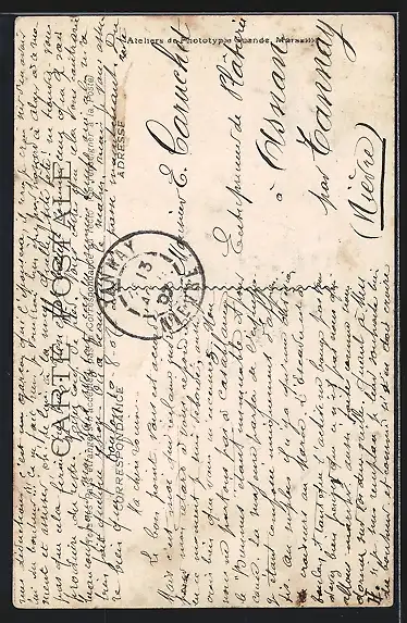 Personenbezogene Daten auf der Rückseite der Karte wurden durch blauen Textmarker unkenntlich gemacht. Die blauen Stellen sind auf die Vorderseite durchgeweicht und wirken sich negativ auf das Postkartenfoto aus