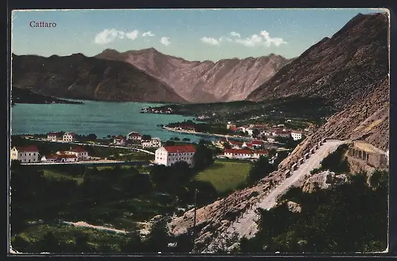 AK Cattaro, Ortsansicht mit Bergpanorama