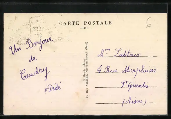 Personenbezogene Daten auf der Rückseite der Karte wurden durch blauen Textmarker unkenntlich gemacht. Die blauen Stellen sind auf die Vorderseite durchgeweicht und wirken sich negativ auf das Postkartenfoto aus