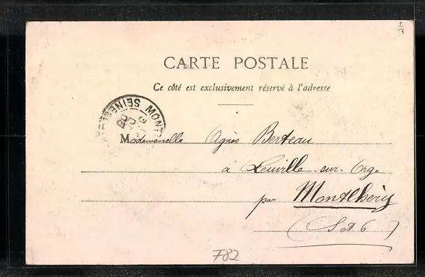 Personenbezogene Daten auf der Rückseite der Karte wurden durch blauen Textmarker unkenntlich gemacht. Die blauen Stellen sind auf die Vorderseite durchgeweicht und wirken sich negativ auf das Postkartenfoto aus
