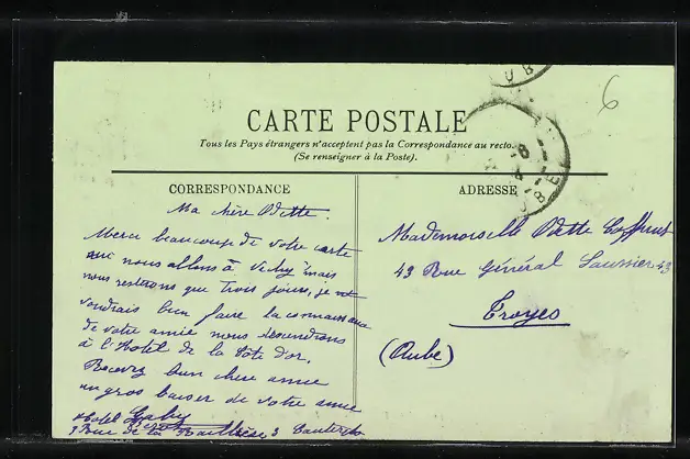 Personenbezogene Daten auf der Rückseite der Karte wurden durch blauen Textmarker unkenntlich gemacht. Die blauen Stellen sind auf die Vorderseite durchgeweicht und wirken sich negativ auf das Postkartenfoto aus