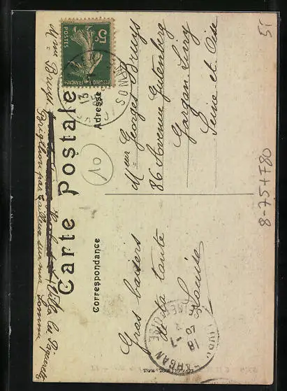 Personenbezogene Daten auf der Rückseite der Karte wurden durch blauen Textmarker unkenntlich gemacht. Die blauen Stellen sind auf die Vorderseite durchgeweicht und wirken sich negativ auf das Postkartenfoto aus