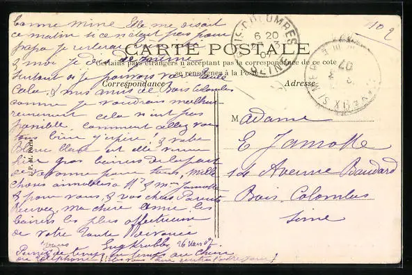 Personenbezogene Daten auf der Rückseite der Karte wurden durch blauen Textmarker unkenntlich gemacht. Die blauen Stellen sind auf die Vorderseite durchgeweicht und wirken sich negativ auf das Postkartenfoto aus