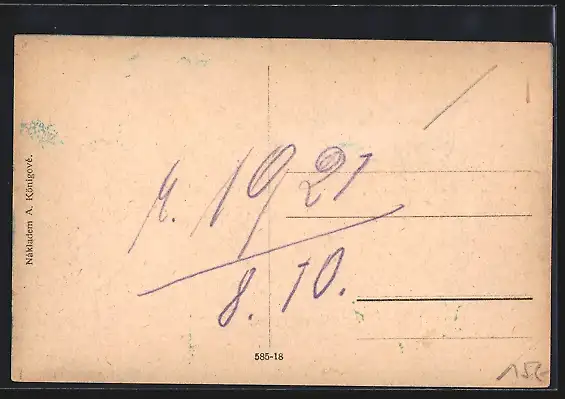 Personenbezogene Daten auf der Rückseite der Karte wurden durch blauen Textmarker unkenntlich gemacht. Die blauen Stellen sind auf die Vorderseite durchgeweicht und wirken sich negativ auf das Postkartenfoto aus