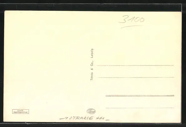 Personenbezogene Daten auf der Rückseite der Karte wurden durch blauen Textmarker unkenntlich gemacht. Die blauen Stellen sind auf die Vorderseite durchgeweicht und wirken sich negativ auf das Postkartenfoto aus