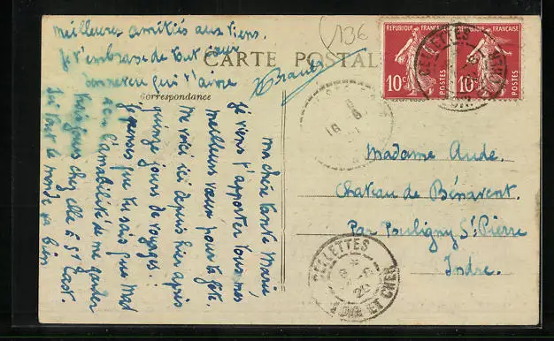 Personenbezogene Daten auf der Rückseite der Karte wurden durch blauen Textmarker unkenntlich gemacht. Die blauen Stellen sind auf die Vorderseite durchgeweicht und wirken sich negativ auf das Postkartenfoto aus