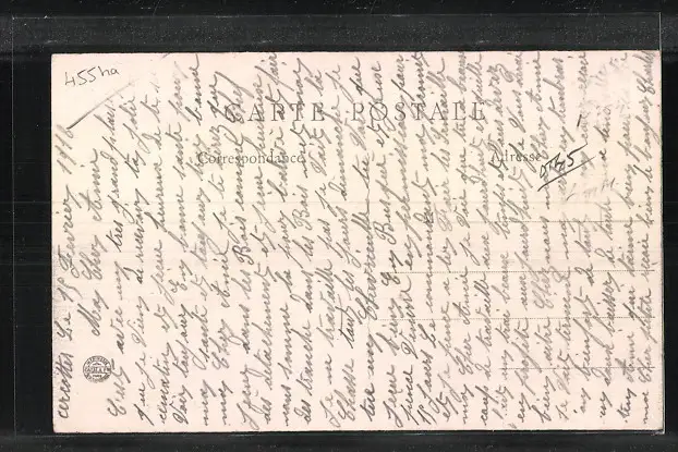 Personenbezogene Daten auf der Rückseite der Karte wurden durch blauen Textmarker unkenntlich gemacht. Die blauen Stellen sind auf die Vorderseite durchgeweicht und wirken sich negativ auf das Postkartenfoto aus