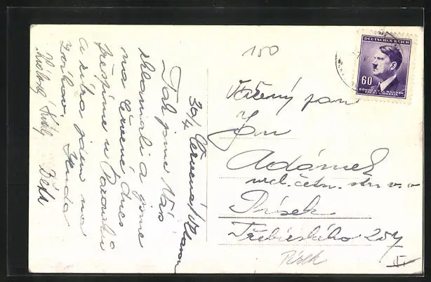 Personenbezogene Daten auf der Rückseite der Karte wurden durch blauen Textmarker unkenntlich gemacht. Die blauen Stellen sind auf die Vorderseite durchgeweicht und wirken sich negativ auf das Postkartenfoto aus