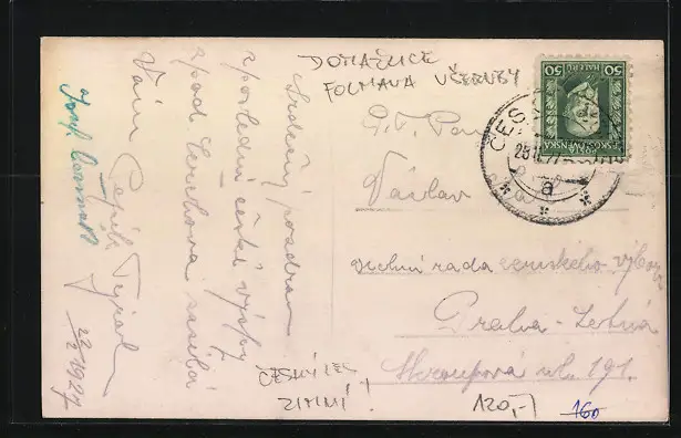 Personenbezogene Daten auf der Rückseite der Karte wurden durch blauen Textmarker unkenntlich gemacht. Die blauen Stellen sind auf die Vorderseite durchgeweicht und wirken sich negativ auf das Postkartenfoto aus