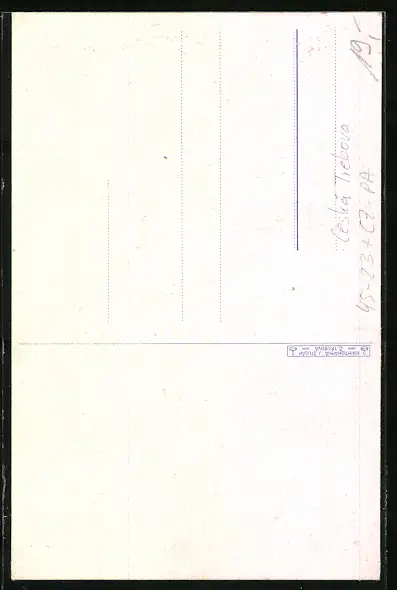 Personenbezogene Daten auf der Rückseite der Karte wurden durch blauen Textmarker unkenntlich gemacht. Die blauen Stellen sind auf die Vorderseite durchgeweicht und wirken sich negativ auf das Postkartenfoto aus