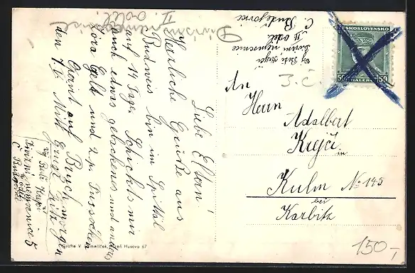 Personenbezogene Daten auf der Rückseite der Karte wurden durch blauen Textmarker unkenntlich gemacht. Die blauen Stellen sind auf die Vorderseite durchgeweicht und wirken sich negativ auf das Postkartenfoto aus