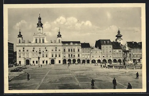 AK Ceské Budejovice, Strassenpartie mit Denkmal