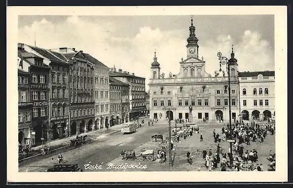 AK Ceské Budejovice, Strassenpartie mit Rathaus