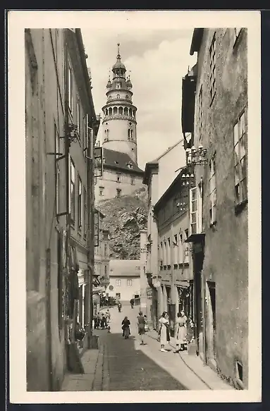 AK Ceský Krumlov, Strassenpartie mit Passanten