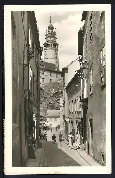 AK Ceský Krumlov, Strassenpartie mit Passanten