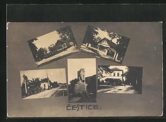 AK Cestice, Ortspartie, Strassenpartie und Denkmal