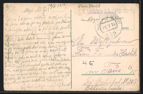 Personenbezogene Daten auf der Rückseite der Karte wurden durch blauen Textmarker unkenntlich gemacht. Die blauen Stellen sind auf die Vorderseite durchgeweicht und wirken sich negativ auf das Postkartenfoto aus