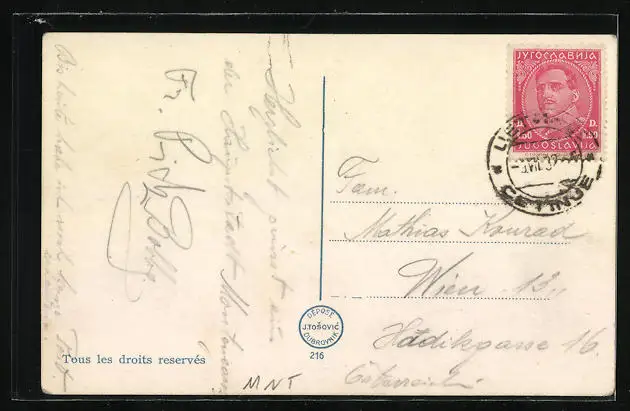 Personenbezogene Daten auf der Rückseite der Karte wurden durch blauen Textmarker unkenntlich gemacht. Die blauen Stellen sind auf die Vorderseite durchgeweicht und wirken sich negativ auf das Postkartenfoto aus