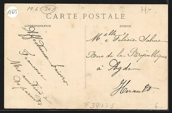 Personenbezogene Daten auf der Rückseite der Karte wurden durch blauen Textmarker unkenntlich gemacht. Die blauen Stellen sind auf die Vorderseite durchgeweicht und wirken sich negativ auf das Postkartenfoto aus