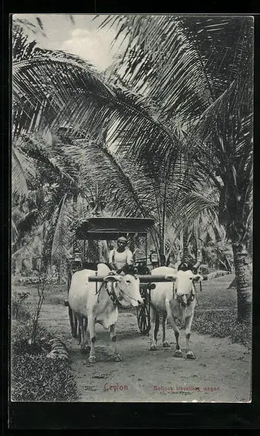 AK Ceylon, Bullock travelling wagon, Gespann unter Palmen