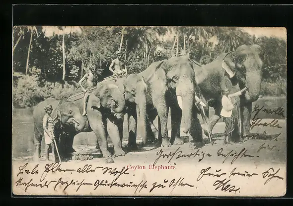 AK Ceylon, Elefanten mit Führern an einem Fluss