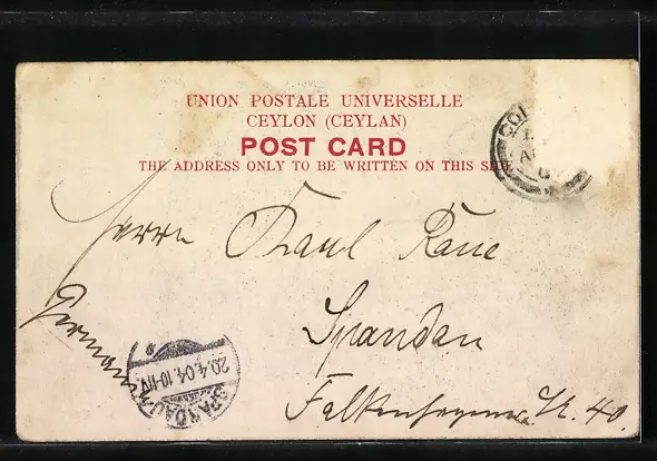 gelaufen 1904, Briefmarke entfernt, rückseitig Oberflächenschaden, Bugspuren unten re., li. u. re. oben, guter Zustand