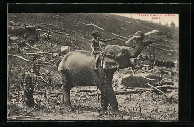 AK Ceylon, Elephant at work on nnew clearing, Arbeits-Elefant mit seinem Führer