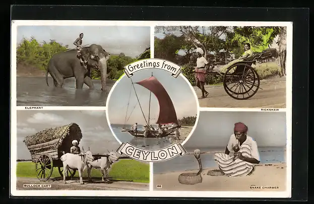 AK Ceylon, Elephant with rider, Rickshaw, Bullock Cart, Snake Charmer