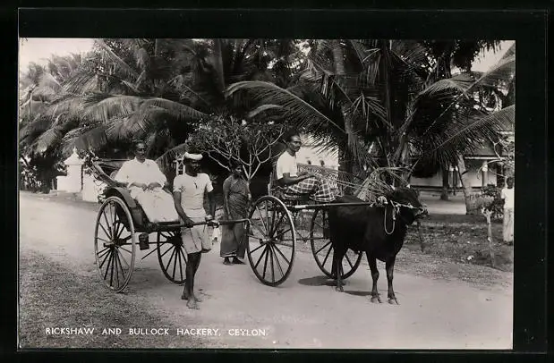 AK Ceylon, Rickshaw and Bullock Hackery, Rikscha-Fahrer mit Fahrgast