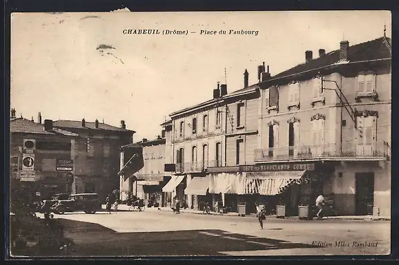 AK Chabeuil, Place du Faubourg avec des bâtiments et des commerces