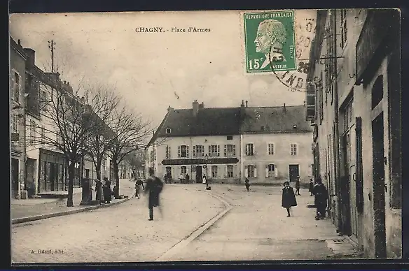 AK Chagny, Place d`Armes avec passants et bâtiments environnants