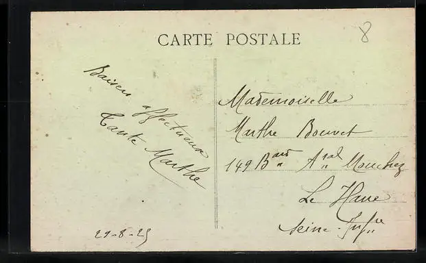 Personenbezogene Daten auf der Rückseite der Karte wurden durch blauen Textmarker unkenntlich gemacht. Die blauen Stellen sind auf die Vorderseite durchgeweicht und wirken sich negativ auf das Postkartenfoto aus